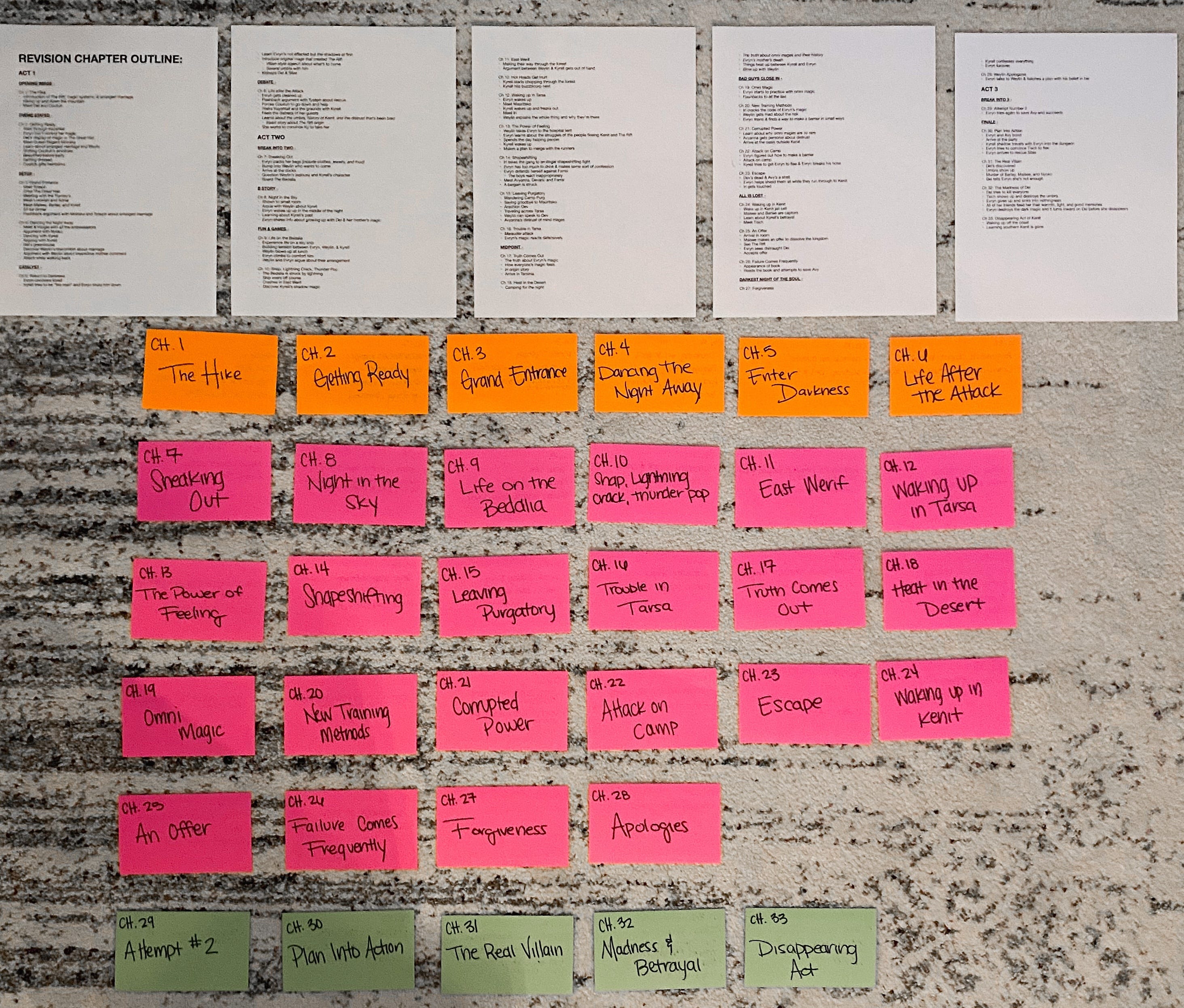 - Make a plan. While I’ve never had a professional editor provide me a formal edit letter, I make myself my own version of an edit letter. I use a combination of multiple resources I’ve come across through the years, but it boils down to me creating buckets for each round of revisions I plan to take and what I want to focus on within each round. Normally, I have buckets for changes corresponding to the highlighter colors I’ve used: World Building, Character Arcs, Magic Systems, Romance, Pacing, and Stakes. Using all the notes I made while reading my printed manuscript, I type up all of the comments and divide them into their corresponding sections.