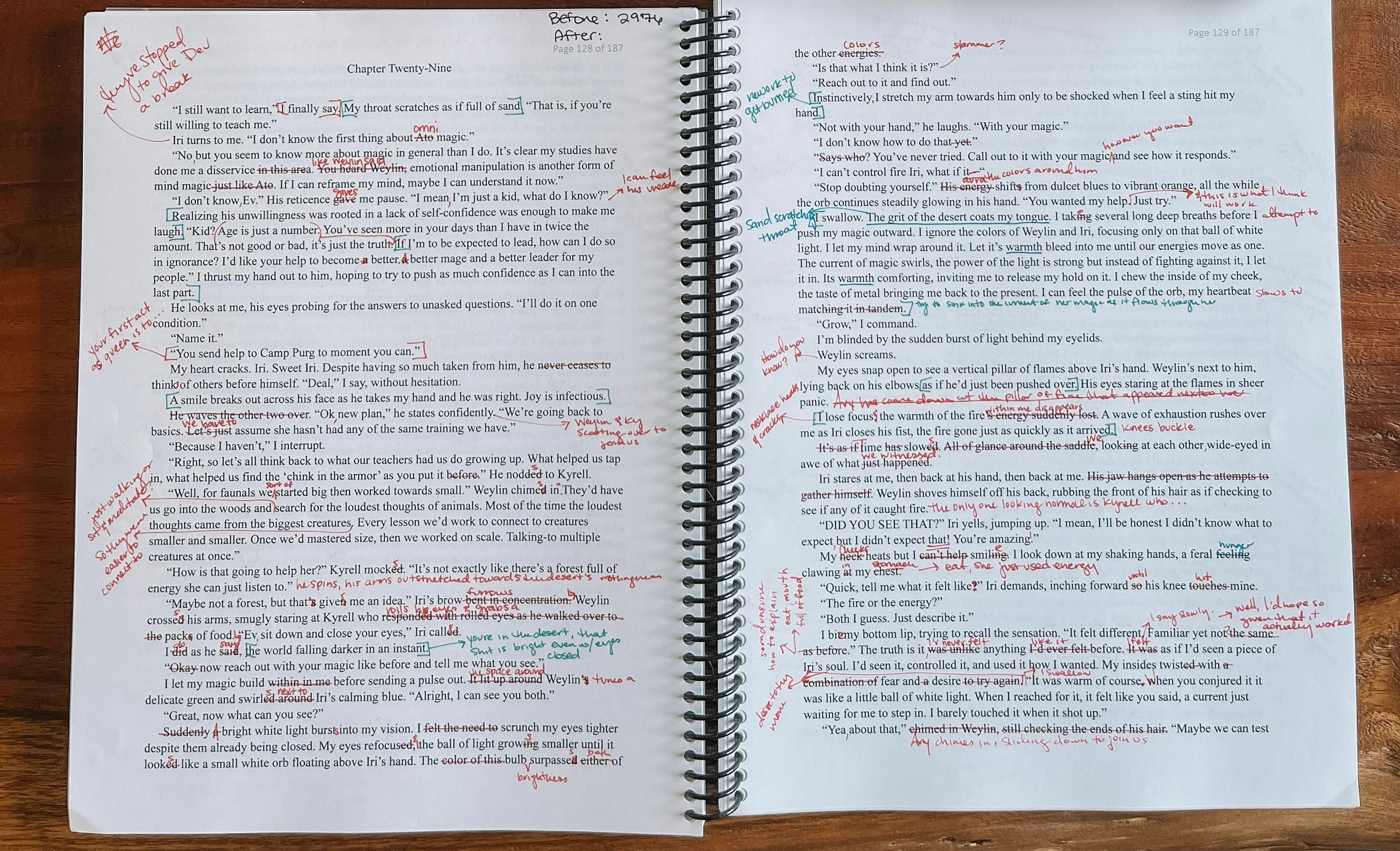 - Writing is reading…and re-reading…and re-reading. For me personally, it’s easiest for me to approach my first read through with a physical version of my book. So I export it out of Scrivener and take it to my closest FedEx Kinkos to get it print and bound. A friend actually just told me about this site that will do it for cheaper and mail it to you, so if you don’t need the instant gratification of same-day printing, definitely try them out. Once I’ve got the bound copy, I sit down with multicolored pens, highlighters, and have a paint party! I choose a different color for different meanings. For my pens, usually it’s RED for cut, GREEN for reword, or BLUE for general notes. For my highlighters, usually its PINK for romance, YELLOW for world building, GREEN for character arcs, PURPLE for pacing, and ORANGE for stakes.I also keep a notebook on hand for more in-depth, big picture changes as well as little things that just need tightening up. Some ridiculous examples from my most recent first draft are: “This character is present in three chapters and then disappears for 90% of the book only to come back and save the day” or “Her mother’s name has changed three times” or “HOW COULD YOU POSSIBLY KILL THEM?!?!”. After each chapter, I make an overview list of all the things that need to be changed, fixed or cut in the notebook and move on to the next chapter. I also use the color-coded tabs to mark where big, potentially story-changing edits will need to be made that I’ll need to revisit later. In general, this is a slow process for me because I’m tackling this as a writer with a different perspective on what does and does not serve my story, so sometimes this can take me two weeks other times a month. But once I’m done, I have a nice stack of notes to go through and make myself an edit letter.
